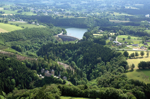 It is situated in the heart of a dense forest on the edge of the Hautes-Fagnes (High Moors) and its origins go far back into the middle-ages. It looms up proudly in a surrounding of hills, on a rocky peak that overlooks a narrow and deep gorge into which the River Warche flows.